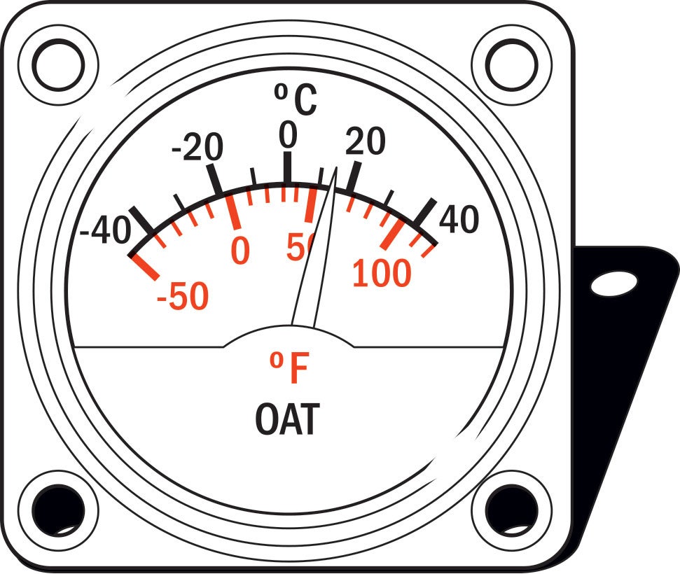 2. OAT — Outside air temperature is essentially the same as SAT. Above 200 knots, a normal OAT probe can’t give an accurate reading because air friction and compressibility cause the indicated temperature to rise.