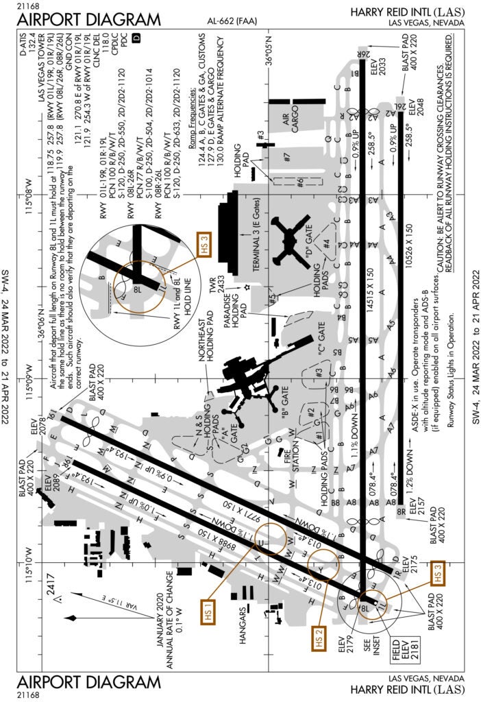 Fun facts: Formerly known as McCarran International Airport until 2021. Also, the Earth’s gradually shifting magnetic pole prompted the FAA to redesignate KLAS runways 7L/25R and 7R/25L to 8L/26R and 8R/26L in 2017—runways are periodically renamed to accommodate for this phenomena.