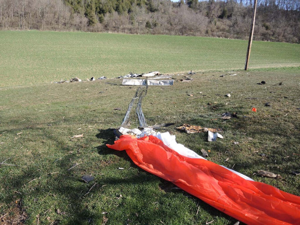 The airframe parachute of the CAPS-equipped Cirrus SR22 G1 lays among the wreckage at the accident site, apparently released by the impact and pressure of the collision with terrain. [Photo: NTSB]