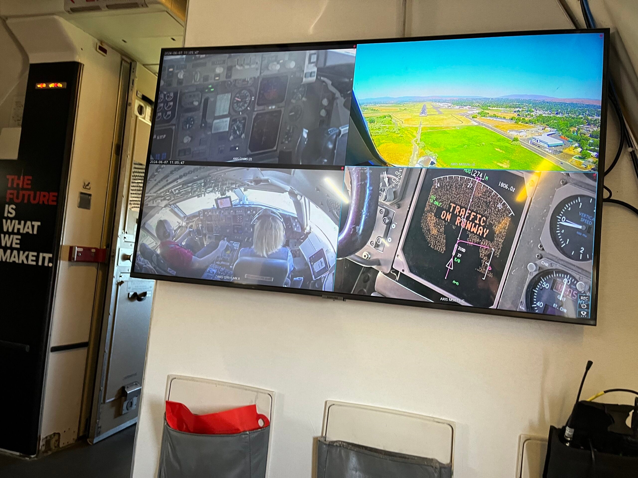 The Honeywell 757 was equipped with cameras in the cockpit and computer monitors in the observer seats to show the pilot's view. [Courtesy: Meg Godlewski]