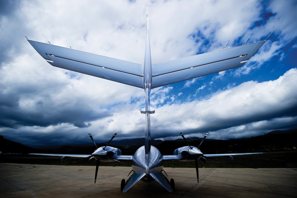 It features a unique "hybrid turboprop/jet" design with rear-mounted pusher propellers that offer practical benefits like not requiring de-icing.
