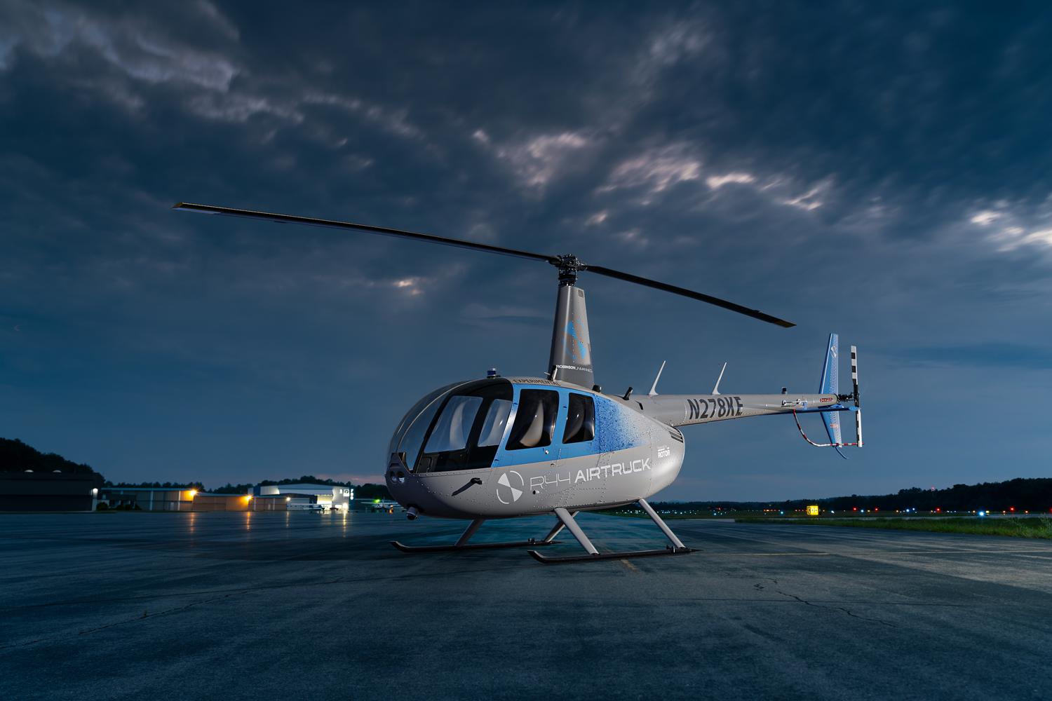 The R44 Airtruck is a heavy-lift platform for cargo transport, resupply, and surveillance missions. It can accommodate about 1,100 pounds within its 63-cubic-foot cargo hold. A sling for external cargo could carry gimbals, cameras, cargo buckets, winches, hoists, firefighting tanks, and most products with a supplemental type certification for the R44.